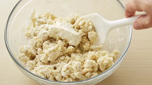 Step2In large bowl, break up cookie dough; stir or knead in 3 oz of the cream cheese and the flour until well mixed. (DO NOT EAT RAW COOKIE DOUGH AFTER COMBINING WITH FLOUR.) Shape into 36 (1 1/4-inch) balls. Place 2 inches apart on cookie sheets.