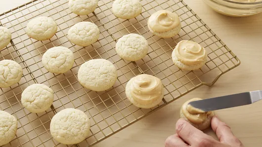 Step4In medium bowl, stir remaining 4 oz cream cheese, 2 tablespoons of the dulce de leche and the powdered sugar until smooth and creamy. Frost cookies.