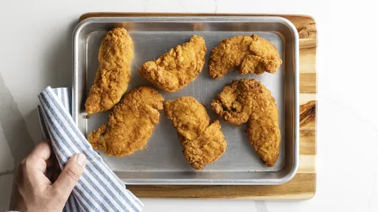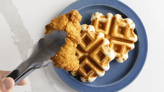 To assemble, stack two waffles on top of each other, then carefully place 1 or 2 prepared chicken tenders on top of the stack.