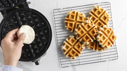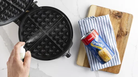 Add each biscuit one at a time to heated waffle maker; close lid, cook up to 3 minutes or until golden brown, and remove. Repeat, starting with spraying the waffle maker until all waffles are complete.