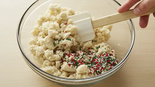 Step1Heat oven to 350°F. In medium bowl, break up cookie dough. Stir or knead in 2 tablespoons candy sprinkles until well blended. Press evenly in 13x9-inch pan.