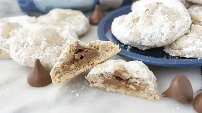 Step4Roll warm cookies in powdered sugar; place on cooling rack. Roll in powdered sugar again.