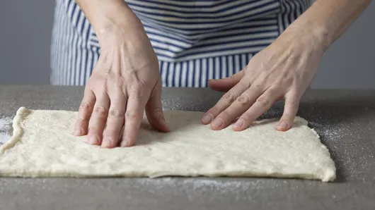 Step2Working with 1 can at a time, unroll dough and place on sugar. Flatten dough to rectangle shape, about 11x7-inches.