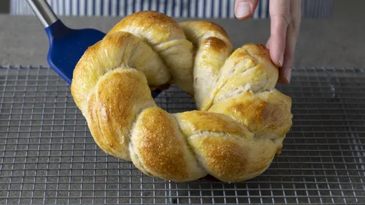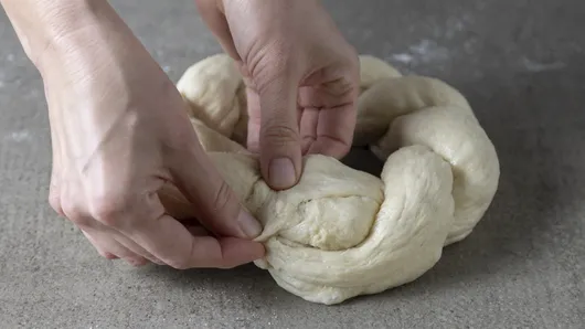 Step7Shape rope into a circle. Connect the 2 ends, and firmly pinch together to seal well. Place dough circle on cookie sheet, and reshape if needed. Brush egg over dough.