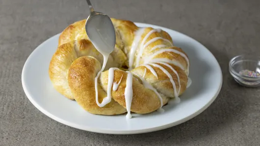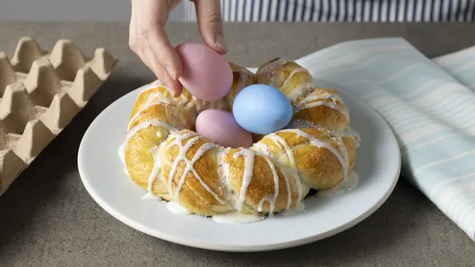 We’ve made this classic Easter bread recipe even easier by skipping the yeast dough and using Pillsbury™ Original French Bread Dough instead. Just roll the dough in sugar for the perfect touch of sweetness, and twist together to make a round shape. After baking, top the loaf with a sweet lemony glaze, sprinkle on some color, and place dyed hard-boiled Easter eggs in the center for that extra-special holiday feel!