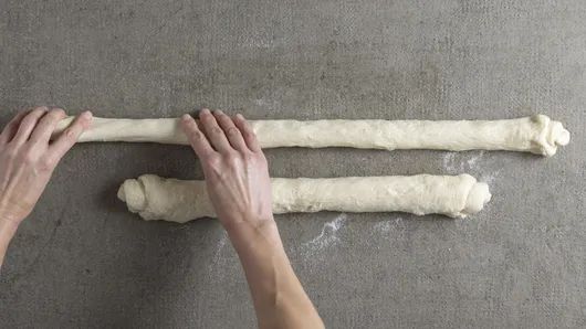 Sprinkle the work surface with a tablespoon of sugar. Place the dough, one can at a time, on top of the sugar, and press flat with your fingers. Roll the dough into a log. Then working the palms of your hands back and forth, form each log of French bread dough into a 24-inch long thin rope.
