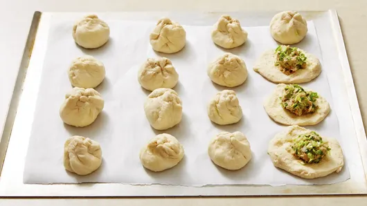 Step3Separate dough into 8 biscuits; separate each biscuit evenly into 2 layers, making 16 dough rounds. Spoon 1 rounded tablespoon pork mixture onto center of each biscuit round; stretch biscuit dough up around ball to cover completely. Pinch edges together on top to seal. Place seam side up 1 inch apart on cookie sheet.