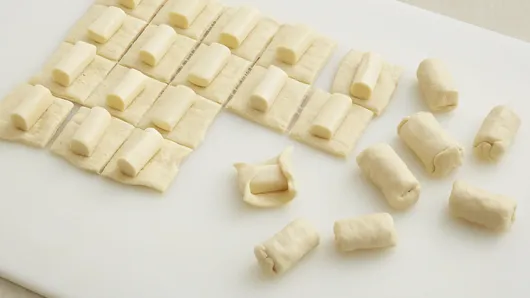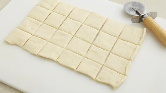Step1Heat oven to 375°F. Unroll dough sheet; press into rectangle, 12x8 inches. Using pizza cutter, cut rectangle into 6 rows by 4 rows to make 24 (2-inch) squares.