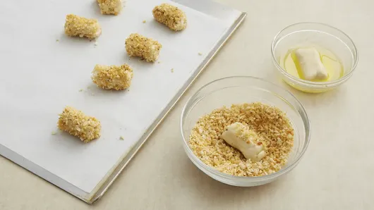 Step3Place melted butter in small bowl. Place bread crumbs in another small bowl. Dip each stick into butter; shake off excess. Roll in bread crumbs to coat. Place about 1 inch apart on ungreased large cookie sheet.