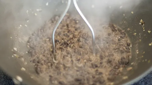 Step2Meanwhile, in 10-inch skillet, heat oil over medium heat. Add garlic and oregano; cook 30 seconds. Stir in black beans and pepper sauce. Add water; cook until reduced by half. Using potato masher or fork, mash beans into a paste. Taste for seasoning; add salt or additional pepper sauce to taste.