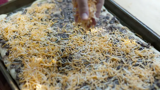 Step3Spread bean mixture evenly over partially baked crust. Top evenly with cheese.