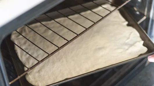 Step1Heat oven to 400°F. Spray or grease 15x10-inch or larger dark or nonstick cookie sheet. Unroll dough onto cookie sheet. Starting at center, press dough into 15x10-inch rectangle. Bake 5 minutes.