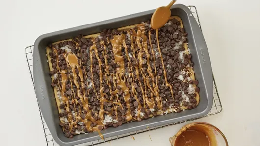 Step3Sprinkle partially baked crust with pecans, coconut and chocolate chips. Drizzle with caramel mixture. Bake 15 to 20 minutes longer or until topping is bubbly. Cool completely, about 1 hour 30 minutes. For bars, cut into 6 rows by 6 rows.