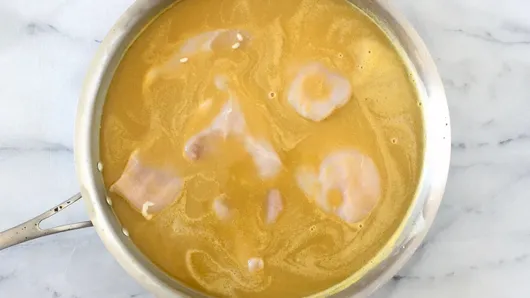 Step2Cut each chicken breast in half at an angle. Place chicken in risotto mixture; gently press chicken down making each one snug in the saucepan.