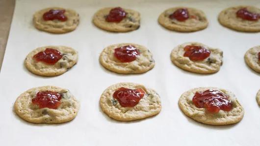 Step2Place 1 teaspoon strawberry jam on center of each cookie.