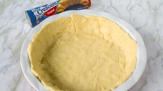 Step2Unroll dough; separate into 8 triangles. Place in ungreased 9-inch pie plate; press over bottom and up sides to form crust.