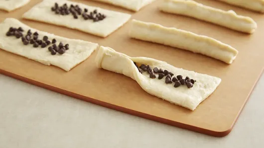 Step2Sprinkle 1/2 teaspoon mini chocolate chips in center of each small rectangle. Pull the 2 long sides together, and pinch to seal.