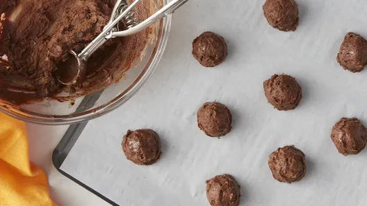 Roll the dough into balls and place on parchment paper-lined baking sheets. Bake one sheet at a time, leaving the second baking sheet in the fridge so the dough doesn’t get too soft before baking. Once the first batch is done baking, pull the second batch from the fridge to bake.