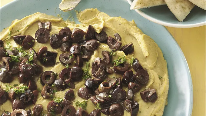 Just Top It: Some of the most popular hummus variations are simply toppings. For pine nut hummus, top the plain hummus recipe with a few tablespoons of toasted, salted pine nuts and a drizzle of olive oil. For olive hummus, top with chopped kalamata olives or prepared tapenade.