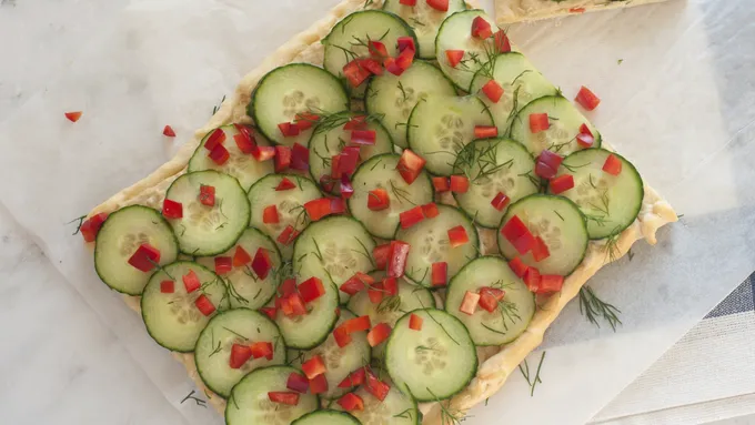 Cucumber Hummus Tart is an easy riff on cucumber sandwiches, using Pillsbury™ Crescent Rolls as the base for a hummus- and veggie-topped brunch app or simple supper.
