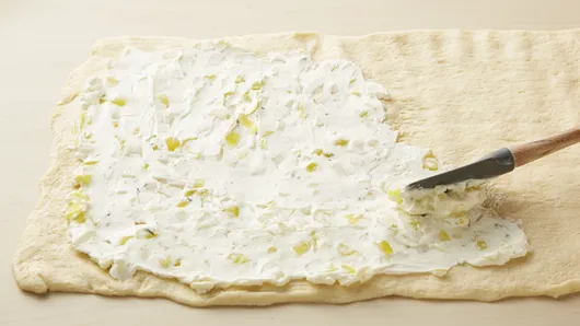 Step2Unroll 1 dough sheet on work surface; reshape into 12x8-inch rectangle. Carefully spread half of the cream cheese mixture onto dough sheet, to within 1 inch of one of the short ends, leaving room to seal the seams.