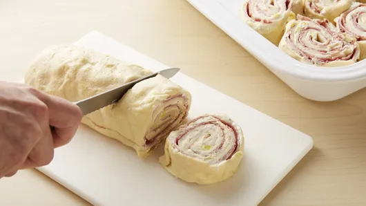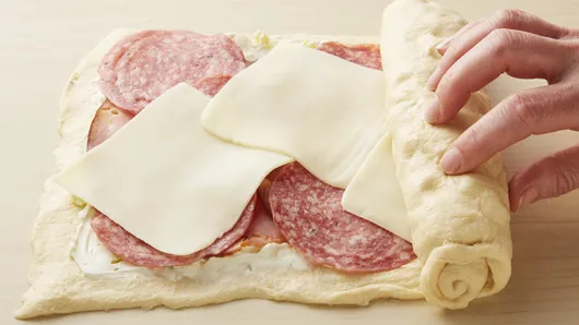 Step3Place 4 ham slices evenly on top of cream cheese mixture, and layer with half of the salami slices and 4 cheese slices. Starting on the short, topped edge of rectangle, roll up tightly and pinch seam together. Repeat for remaining dough sheet.