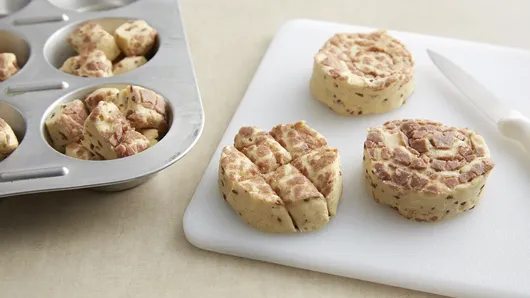 Step2Separate dough into 8 rolls. Cut each roll into 6 pieces; place 6 pieces in each muffin cup.