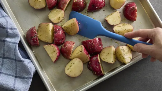 Rimmed Sheet Pan: We used a 15x10x1-inch stainless steel rimmed sheet pan, also known as a “jelly roll” pan, since it’s the perfect size for roasting 1 1/2 pounds of potatoes. To get their crispy crust, these potatoes need to have a little room around them, so the steam can evaporate, allowing the potato edges to crisp up. If you must choose between a smaller or larger pan, opt for larger.