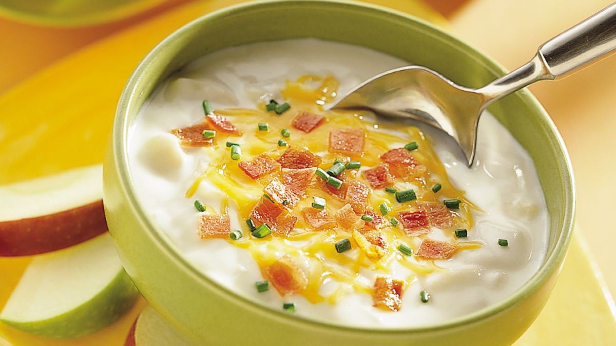 Step3Stir in sour cream; mix well. Top individual servings with cheese, bacon and chives.