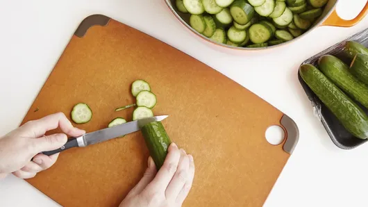 Step2Wash cucumbers and slice lengthwise or into coins. Add to gallon container (an ice cream bucket works great).
