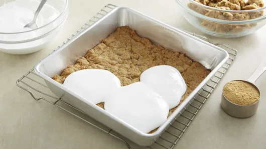 Spoon marshmallow creme evenly over partially baked dough; sprinkle with remaining 1/4 cup graham cracker crumbs. Crumble remaining cookie dough on top.
