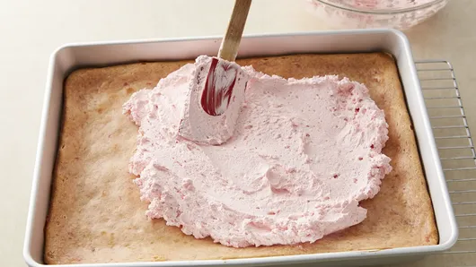 Step4In medium bowl, mix whipped topping, food color and remaining 1/4 cup strawberry topping. Spread topping mixture over cooled cream cheese layer. Refrigerate about 2 hours or until set. To serve, cut into 6 rows by 3 rows. Garnish each serving with fresh berries. Cover and refrigerate any remaining dessert.