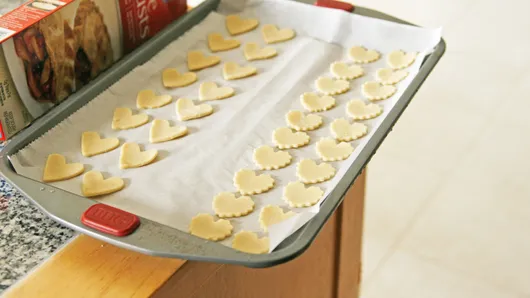 Step3Unroll pie crust onto cutting board. Using mini (1-inch) heart-shaped cookie cutter, cut pastry into hearts; place on cookie sheet.