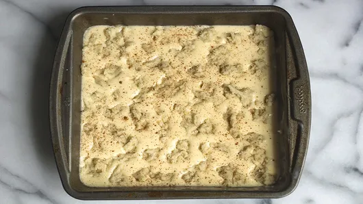 Step4Crumble and sprinkle remaining half of cookie dough over cheesecake mixture. Sprinkle evenly with remaining 1/4 teaspoon cinnamon.