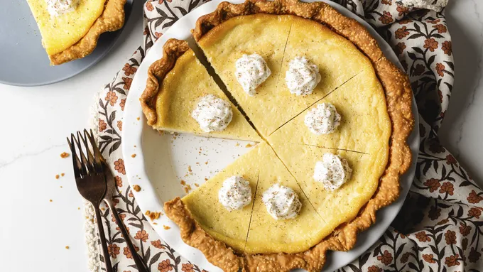 Step3In bowl of stand mixer or in medium bowl with hand mixer, beat cream cheese and eggnog until smooth. Add sugar, egg yolk and 1/4 teaspoon of the cinnamon; mix until combined. Evenly spread cheesecake mixture over cookie crust.