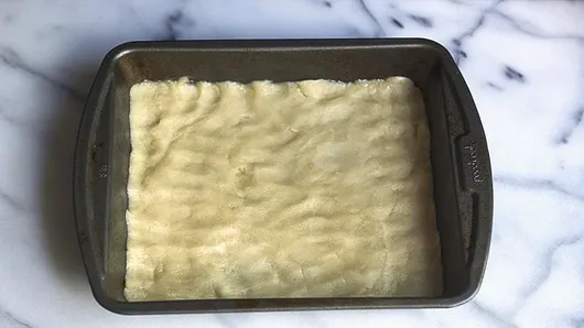 Step2With floured-fingers, press half of cookie dough in bottom of pan. (DO NOT EAT RAW COOKIE DOUGH AFTER PRESSING DOUGH IN PAN WITH FLOURED FINGERS.)