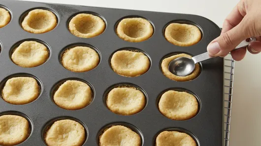 Step2Bake 15 to 18 minutes or until golden brown. With back of round metal measuring teaspoon, make a 1 1/4-inch-wide indentation in each cookie cup. Cool completely in pan about 30 minutes. Carefully, run knife or metal spatula around edges of cookie cups to loosen. Remove from pan to serving plate.