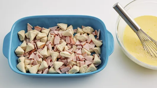 Step2Separate 1 can Pillsbury™ Grands!™ Southern Homestyle refrigerated Southern Recipe biscuits into 8 biscuits. Cut each biscuit into 8 pieces; place in baking dish. Add 8 oz thinly sliced Canadian bacon, chopped; mix gently with biscuit pieces.