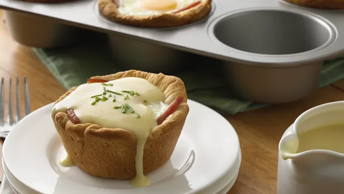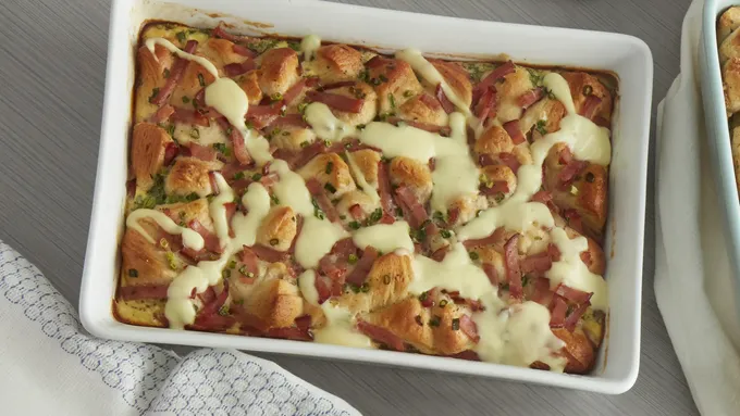 This weekend, stay in your PJs and make a restaurant-worthy breakfast right in your kitchen! This five-ingredient bubble-up bake tastes just like Eggs Benedict without all the fuss. When you serve this easy casserole with a creamy hollandaise sauce and fresh chives, every bite is reminiscent of the classic diner dish—but you never had to leave the house.