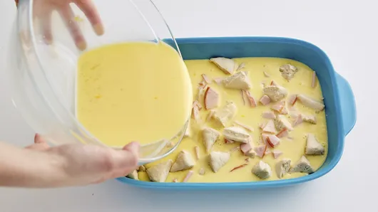 Step3In medium bowl, beat 8 eggs and 2 cups milk with whisk until well blended. Pour over biscuit mixture.