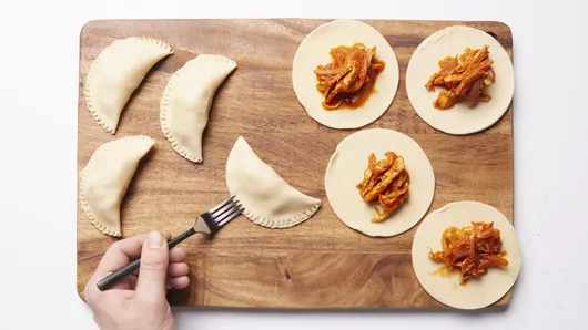 Unroll both pie crusts. Using a 4- to 5-inch round cutter or a round glass, cut out 5 circles from each crust for 10 total circles. Place about 2 to 3 tablespoons of tinga filling in the center of each round. Fold over to enclose the filling and create a half-moon shape. Press together the edges to seal, then use a fork to crimp the edges.