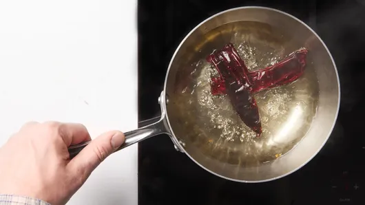 To start the sauce, first soften the seeded and stemmed chiles. Add dried guajillo chiles to a small saucepan, cover with water, and place over medium-high heat. Bring to a boil, and let gently boil for 5 minutes. Remove from heat and let cool down for 15 to 20 minutes or until the chiles are pliable and softened. Remove the chiles with a slotted spoon and discard the water.
