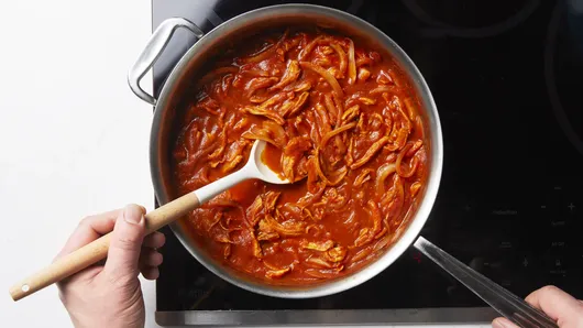 For the filling, heat 1 tablespoon avocado oil over medium heat in a large skillet. Add 1/2 sliced medium white onion, and cook for 3 to 5 minutes, until softened. Stir in shredded chicken and cook for 2 minutes. Pour in the blended sauce and simmer uncovered for 10 to 15 minutes, stirring occasionally, until slightly thickened. Let the filling cool for about 15 minutes before assembling empanadas.