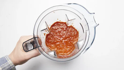 In a blender, combine softened guajillo chiles, fire roasted tomatoes, chipotle chile, garlic, oregano, cumin, salt, black pepper, 1/4 small white onion, and chicken stock. Blend until smooth. Set aside.