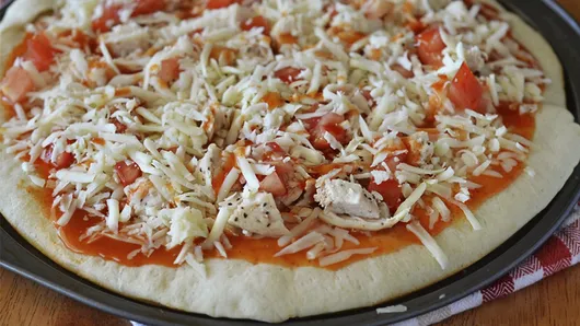 Step3Remove partially baked crust from oven. Spread enchilada sauce over crust. Top evenly with cheese, chicken and tomatoes.