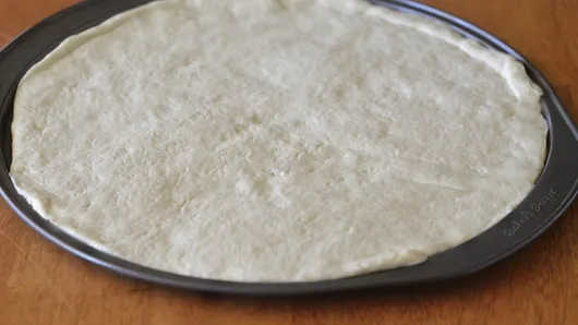 Step1Heat oven to 400°F. Grease 12-inch pizza pan with shortening or spray with cooking spray. Unroll dough on pan; press out dough to edge of pan.