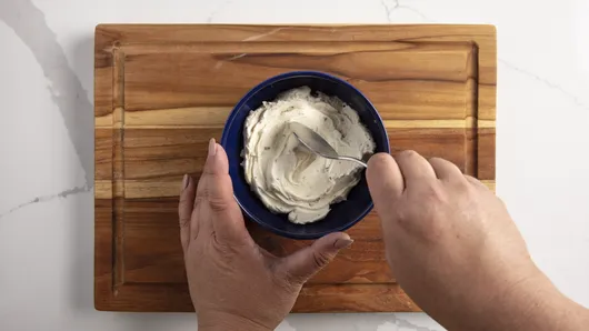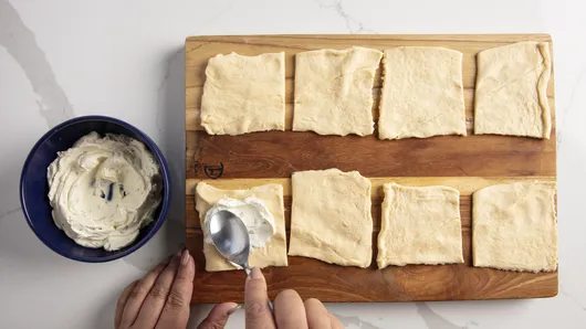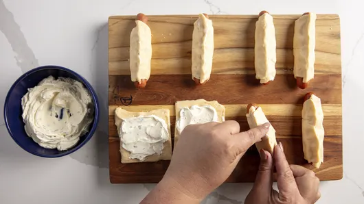 This step is quick thanks to cream cheese spread—no need to soften it. Pour the seasoning mix onto a plate to make it easy to coat the tops of the crescent dogs.