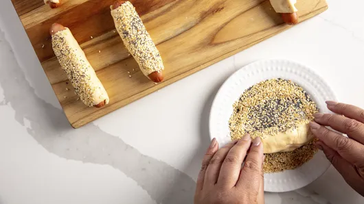 No, you don’t need to cook the hot dogs before assembling these easy everything bagel crescent dogs. Hot dogs are fully cooked when purchased and will heat through as the dough bakes in the oven. It's actually easier to wrap the dough around cold hot dogs as warm ones can make the dough soft and sticky, making it harder to handle. Keeping the hot dogs cold helps maintain the dough’s flakiness and makes the whole process smoother.