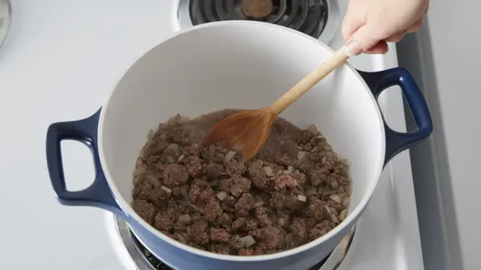 In 4-quart saucepan or Dutch oven, cook beef and onions over medium-high heat 7 to 9 minutes, stirring frequently, until beef is thoroughly cooked; drain.