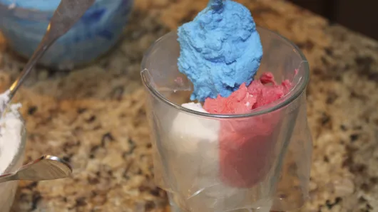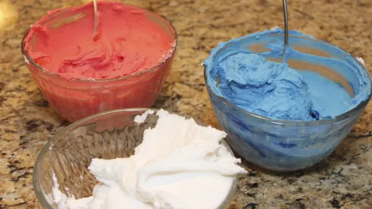 Step3In medium bowl, beat butter and powdered sugar with electric mixer on medium-low speed until well mixed. Gradually beat in milk and vanilla. Divide frosting evenly among 3 bowls. Tint 1 red and 1 blue. Leave the other white.